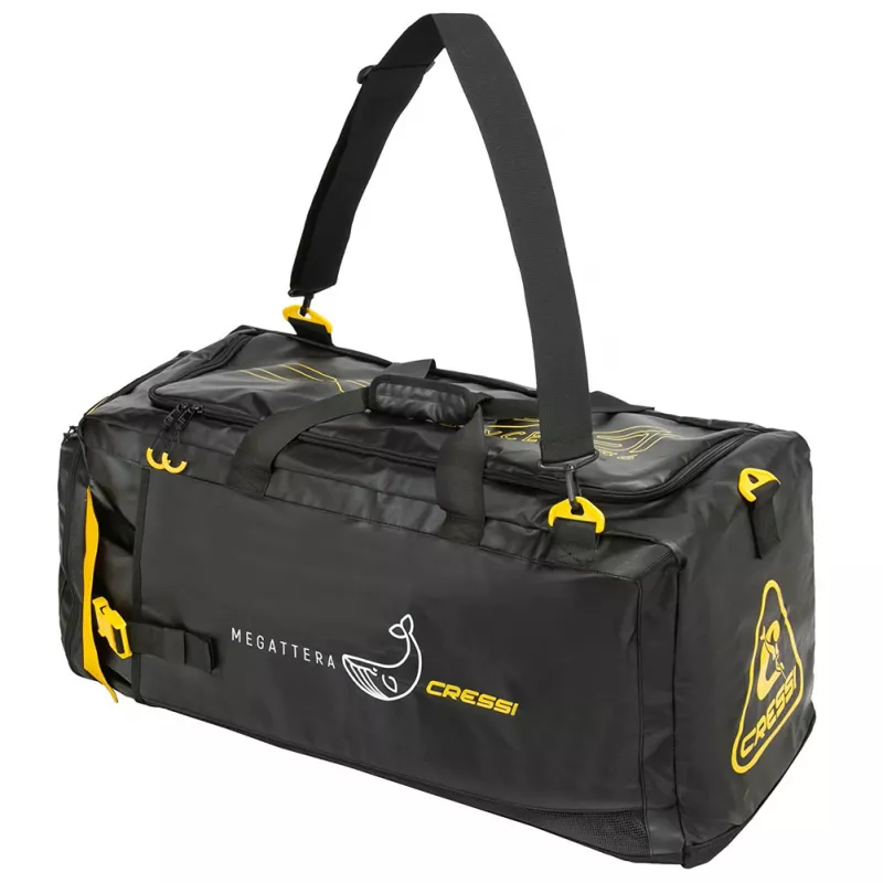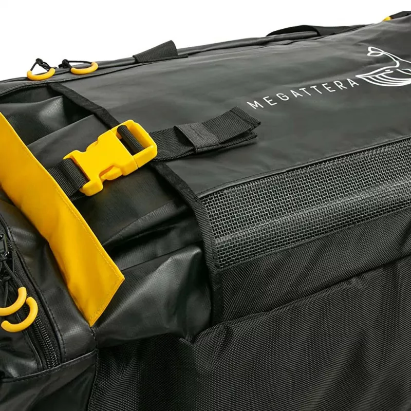 Desweiteren ferfügt sie über einem praktischen oberen Reißverschluss zum einfachen Tragen. Für die Tauchasrüstung und Zubehörteile hat die Megattera zwei spezielle Taschen für Taucher. Die erste kann mit einer Schnalle verschlossen werden, perfekt zum Tragen von Taucherflossen; die zweite Tasche ist ein wasserdichtes Innenfach für Trageausrüstung und nasse Kleidung.