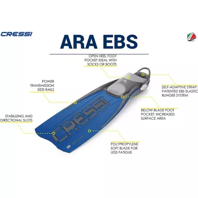 Cressi hat diese speziellen Flossenbänder entwickelt, um den Ansprüchen der anspruchsvollsten Taucher zu entsprechen. Die eine bequeme doch gleichzeitig sehr praktische und handliche Anziehtechnik benötigen. Seine spezielle große Öse macht die Anziehvorgänge auch mit dicken oder Dreifingerhandschuhen für sehr kalte Gewässer besonders mühelos. Das Fehlen von Regulierungen aufgrund der extremen Elastizität des verstärkten Teils verkürzt die Zeit zur Anpassung der Ausrüstung auf den ersten Metern des Tauchgangs erheblich und lässt die Flosse trotz des zunehmenden Wasserdrucks stets fest anliegen.