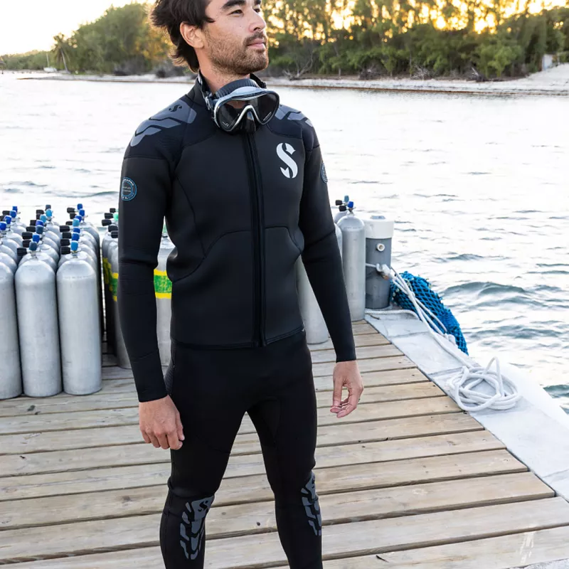 das Material wurde speziell entwickelt, um der Kompression des Neoprenanzugs beim Tauchen zu widerstehen. Der Anzug wird mit einem lösungsmittelfreien Klebstoff zusammengesetzt und im Flachstichverfahren vernäht.