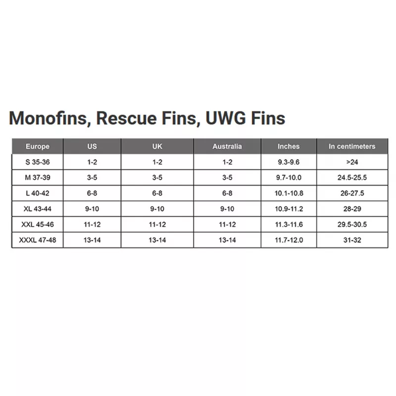 • Flossenmaße mit Fußtaschen Größe XL ~ 22cm (Breite) x 55 cm (Länge)