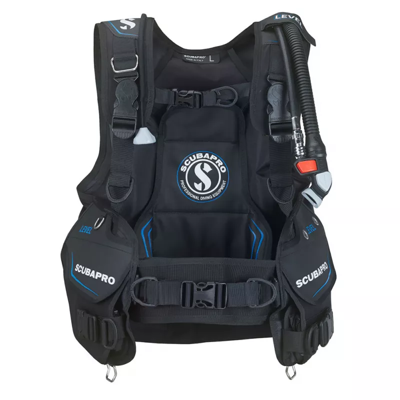Zusätzlich enthält das LEVEL zwei große Cargo Taschen, von denen eine mit Metallösen für das Anbringen eines Messers ausgestattet ist, vier D-Ringe für das Befestigen von zusätzlicher Ausrüstung und zwei Oktopus-Taschen für das sichere Verstauen eines Oktopus- und Konsolenschlauchs.