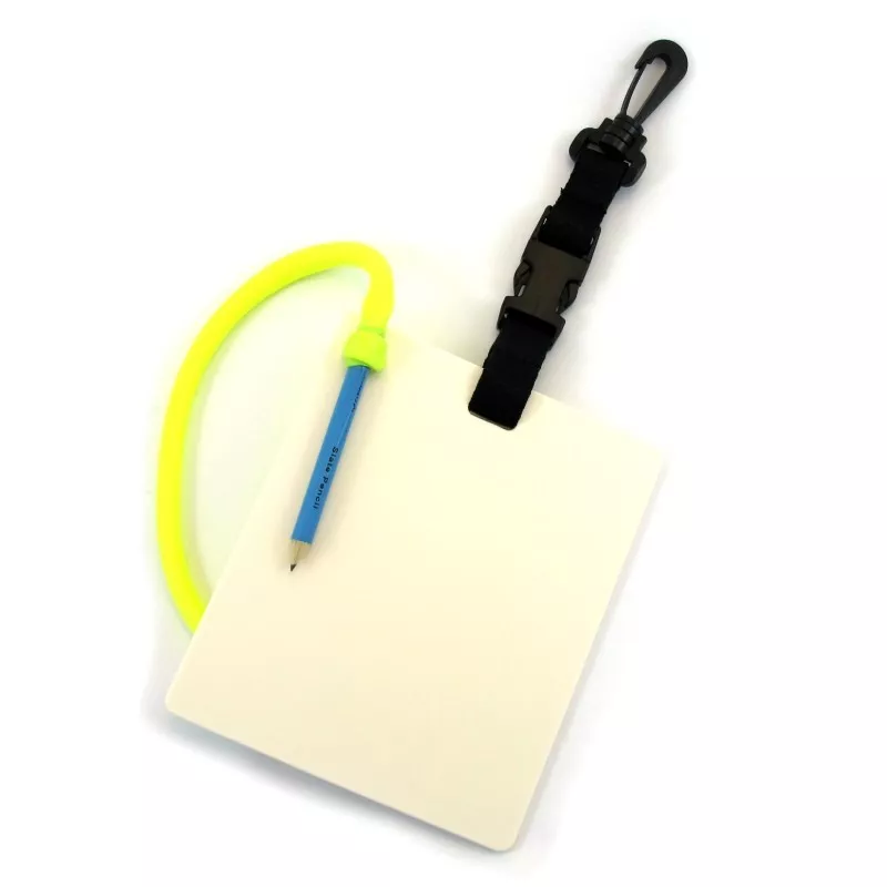 Plastikschreibtafel mit Stift für kleine Botschaften unter Wasser. Die Tafel kann an dem Clipverbinder abgetrennt werden, so das auch der Buddy eine Nachricht verfassen kann.