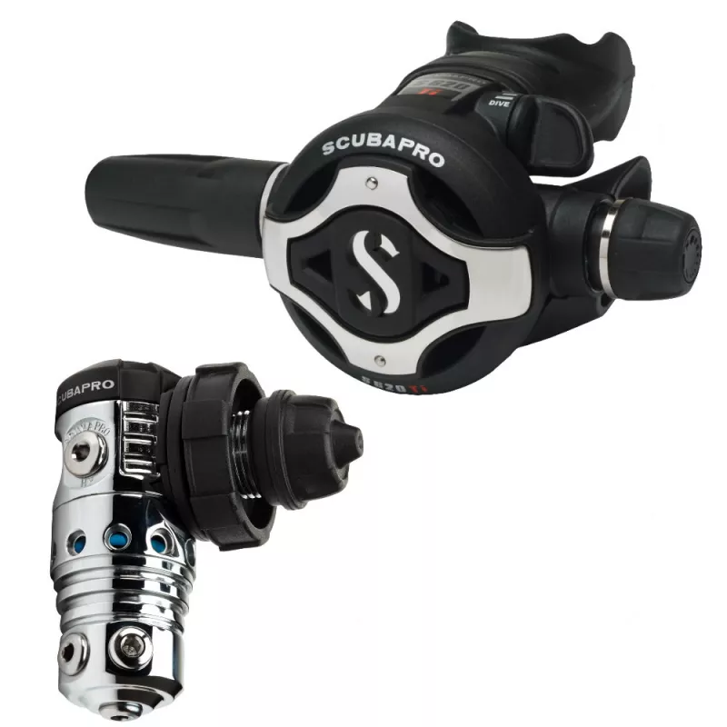 SCUBAPRO kombiniert den leistungsstarken MK25 EVO hier mit dem pneumatisch balancierten S620 Ti. Der MK25 EVO bietet einen ausgezeichneten Vereisungsschutz, eine hohe Empfindlichkeit beim Einatmen und eine prompte Luftlieferleistung. Der S620 Ti vereint die besten Eigenschaften des SCUBAPRO S600 in modernstem Design. Der S620 Ti ist kleiner als der S600 besitzt aber eine gleich große Membrane. Dadurch ist die Atemarbeit gegenüber dem S600 noch einmal um 37 % geringer. Durch das Ventilrohr aus Titan ist der S620Ti auch leichter. Der große Luftduschenknopf verbessert die Luftzirkulation im Inneren der Zweiten Stufe, während der optimierte Blasenabweiser zu einer weiteren Reduzierung des Ausatemwiderstands führt und die Blasen der ausgeatmeten Luft gezielt aus dem Gesichtsfeld des Tauchers leitet. Dieses neue Atemreglersystem ist in jeder Situation ein echter Champion.