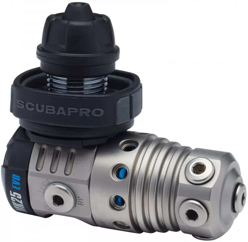 Mit dem MK25 EVO T/S620 Ti präsentiert SCUBAPRO ein ultraleichtes und extrem korrosionsbeständige Atemreglersystem mit Top-Line-Performance. Der MK25 EVO T ist aus einem soliden Titanblock gefräst, der auch unter konzentriertem Salzwasserbedingungen keine Korrosionserscheinungen zeigt. Der neue S620 Ti vereint die besten Eigenschaften des SCUBAPRO S600 in modernstem Design. Der S620 Ti ist kleiner als der S600 besitzt aber eine gleich große Membrane. Dadurch konnte die Atemarbeit gegenüber dem S600 noch einmal um 37 % gesenkt werden. Durch das Ventilrohr aus Titan ist der S620Ti auch leichter. Der große Luftduschenknopf verbessert die Luftzirkulation im Inneren der Zweiten Stufe, während der optimierte Blasenabweiser zu einer weiteren Reduzierung des Ausatemwiderstandes führt und die Blasen der Ausatemluft gezielt aus dem Gesichtsfeld des Tauchers leitet.