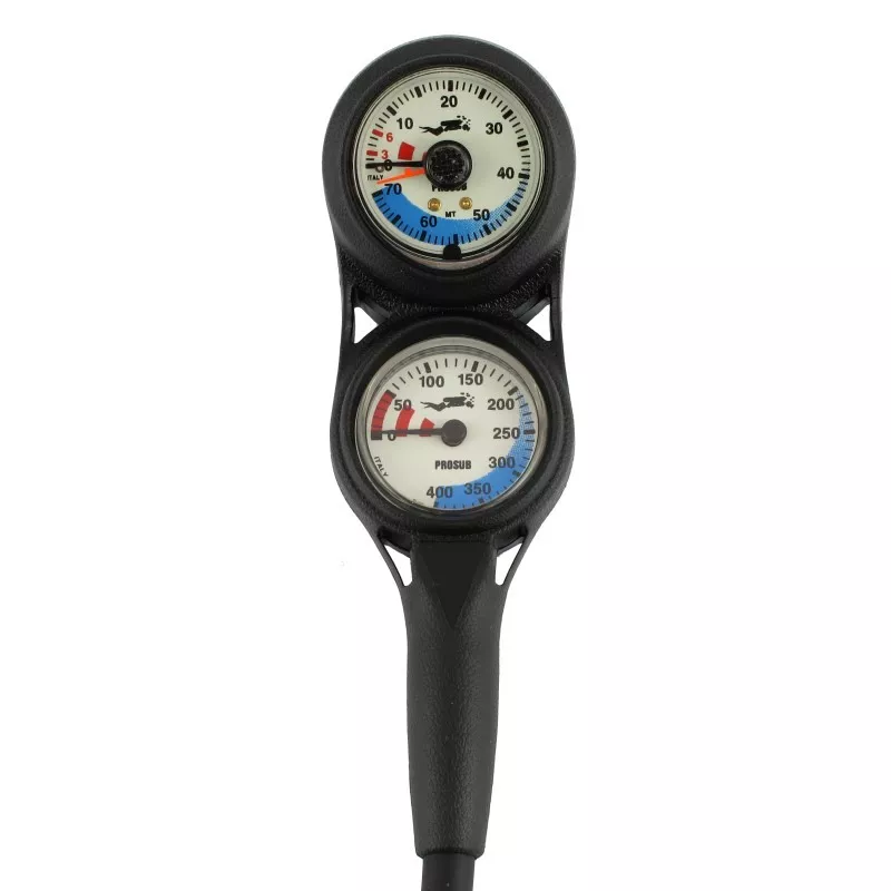 Die Slim Line 2-fach Konsole ist eine handliche Konsole mit Finimeter und Tiefenmesser. Diese Konsole findet man auch im Programm anderer nahmhafter Tauchsport Hersteller. Das flache Finimeter in dem 40mm Metallgehäuse ist bis 400 Bar geeignet. Der Tiefenmesser hat einen Bereich von 0-70 Metern in der flachen 40mm Ausführung und hat einen Schleppzeiger. Die Konsole ist Schock resistent.