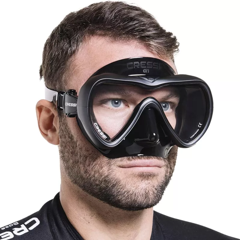 Die A1-Maske wurde in einem attraktiven Stil entworfen und bietet eine hohe Leistung für das Tauchen und Freitauchen. Es verfügt über eine Einzellinse aus gehärtetem Glas mit einer speziellen Behandlung, die es vollständig beschlagfrei macht. Taucherbrille die nicht beschlägt. Dies ist eine großartige Funktion für jede Art von Tauchgang. Die Linsen sind geneigt und haben eine umgekehrte Tropfenform, wodurch die Sicht nach unten erhöht wird. Dies ermöglicht eine bessere Kontrolle der Tauchausrüstung. Der Rock und der Riemen bestehen aus einem weichen Silikon, das eine hohe Anpassungsfähigkeit für die meisten verschiedenen Gesichtsformen gewährleistet. Die Oberseite der Innenschürze weist eine Doppelkante auf, die die Abdichtung drastisch erhöht. Das Design der Abflussschürze verbessert den Wasserausstoß während des Maskenabstands und minimiert das Sammeln von Wasser.