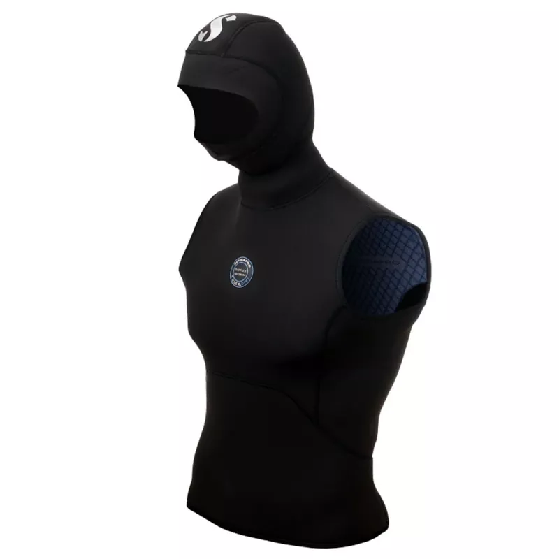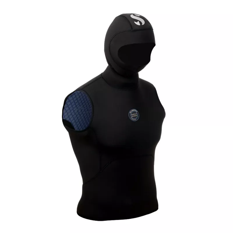 In Kombination mit einem SCUBAPRO Steamer oder Shorty getragen, diese Neopren Tauchweste erhöht sie den Wärmeschutz mit 5 mm starkes Material den Oberkörper, während an den Seiten 3 mm starke Einsätze für mehr Bewegungsfreiheit sorgen. Für den Wärmeschutz rund um den Kopf sorgt die angesetzte 3 mm starke Kopfhaube in Kombination mit einer 2 mm Gesichtsmanschette, die das Eindringen von Wasser verhindert und den Wärmeverlust minimiert.